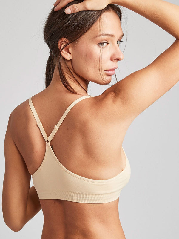 Low-profile V-neck and slim racerback sit flat under tees for a discreet, streamlined look during workouts or casual wear.